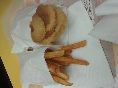 妹點蘑菇牛肉堡 120 元 + 75 元套餐 : 洋蔥圈 + 無限續杯飲料。