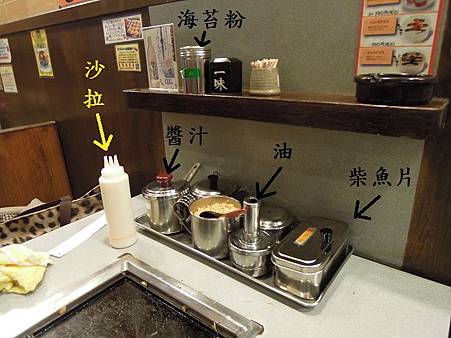 倒完之後,店員又開始講一堆日文 + 在章魚燒上比劃,